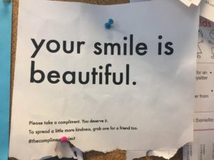 It says, “Please take a compliment. You deserve it. To spread a little more kindness, grab one for a friend too.”